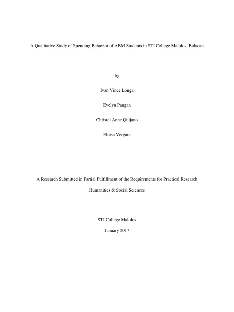 The list of theses below demonstrates the broad array of substantive subject areas to which our graduates qualitative research title examples. I a qualitative study of spending behavior of abm students in sti college malolos, bulacan by ivan vince longa christel anne quijano eloisa vergara a research submitted in partial fulfillment of the requirements for practical research humanities & social sciences sti college malolos march 2017 chapter 1 the problem and its background introduction allowance is the amount of something available.